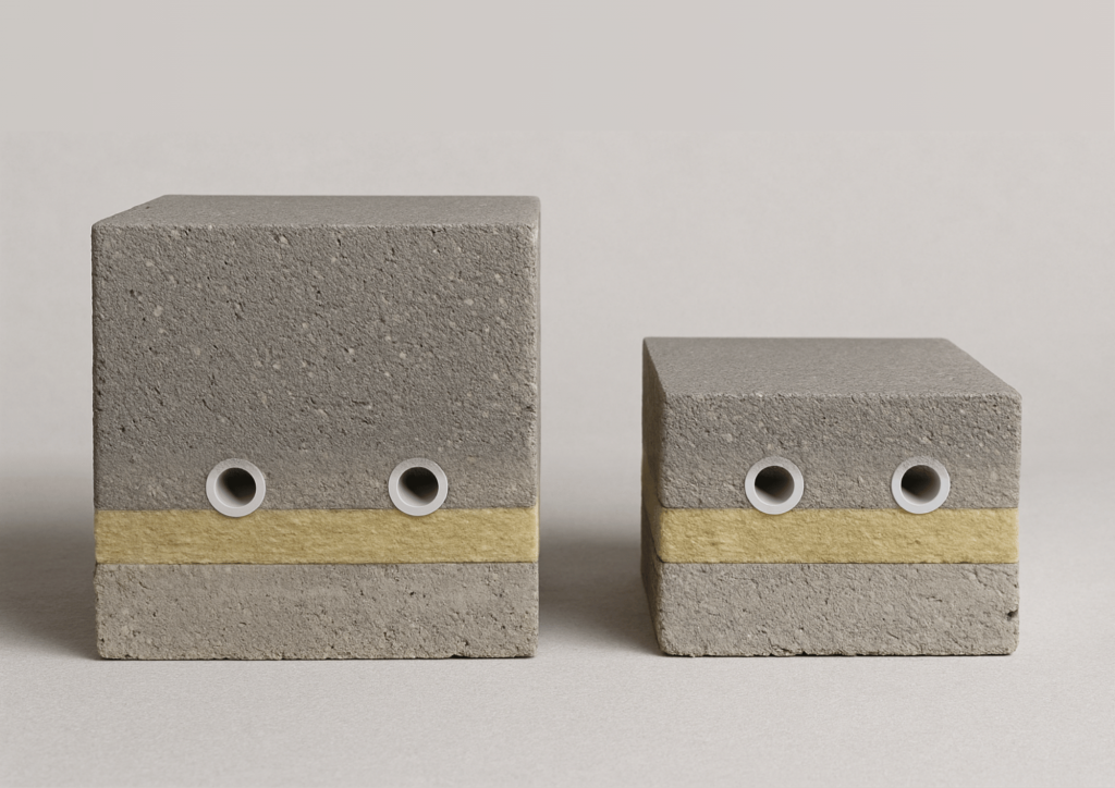 Dies entspricht einer Reduzierung von 40 %. Eine solche Optimierung gleicht nicht nur mögliche Höhenbeschränkungen aus, sondern spart auch erheblich Material – was zu geringeren Kosten und einer reduzierten CO₂-Bilanz durch den minimierten Zementgehalt führt.